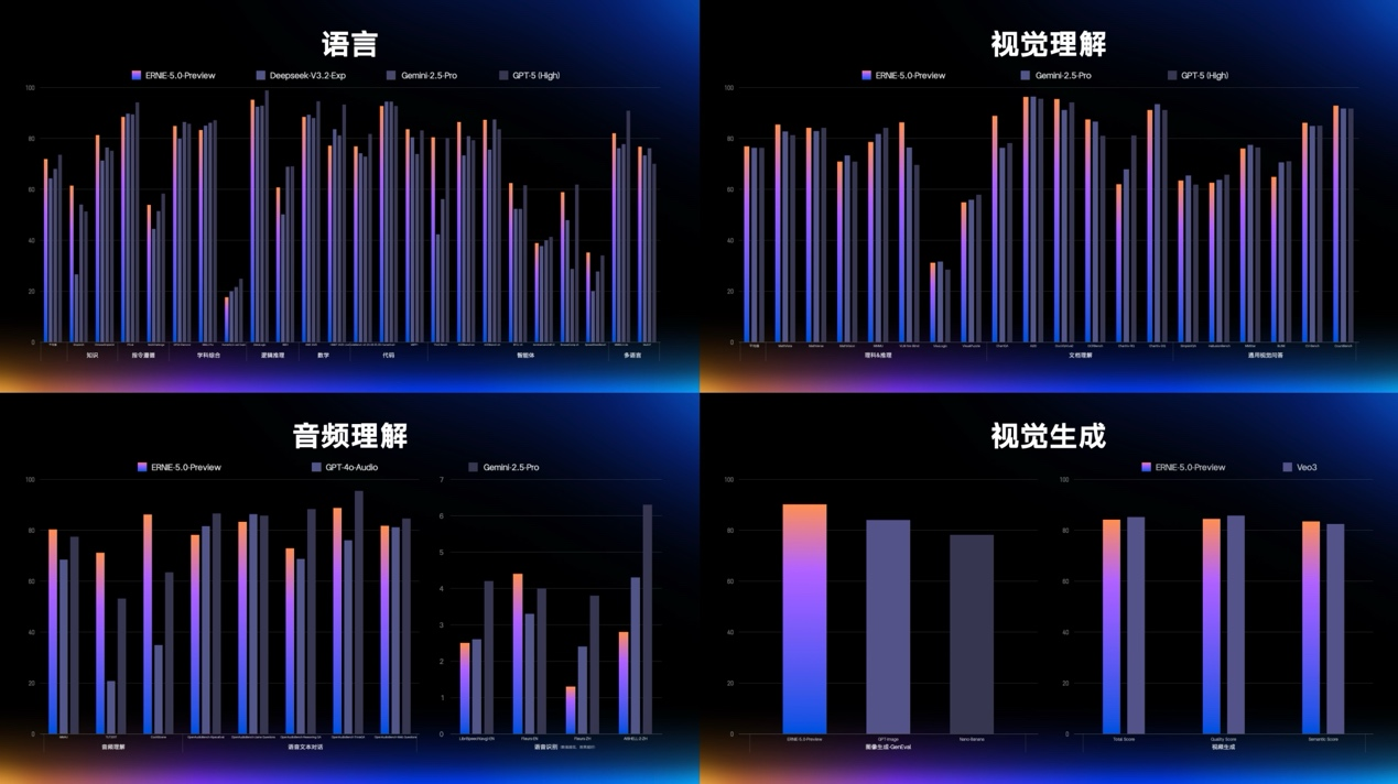 文心5.0基础能力全面升级,在多模态理解、指令遵循、创意写作、事实性、智能体规划与工具应用等方面表现突出,拥有强大的理解、逻辑、记忆和说服力。在40余项权威基准的综合评测中,其语言与多模态理解能力与Gemini-2.5-Pro、GPT-5-High等模型持平,图像与视频生成能力与垂直领域专精模型相当,达到全球领先水平,验证了原生全模态大模型的能力和潜力。