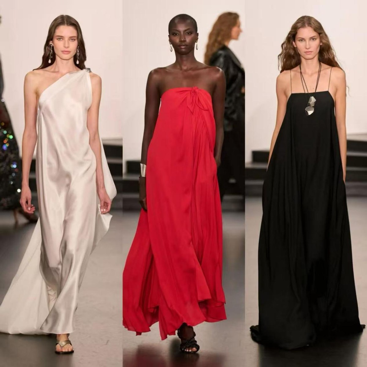 斜肩白色长裙,飘逸自由;红色抹胸长裙,热烈明艳;黑色吊带长裙,成熟干练。