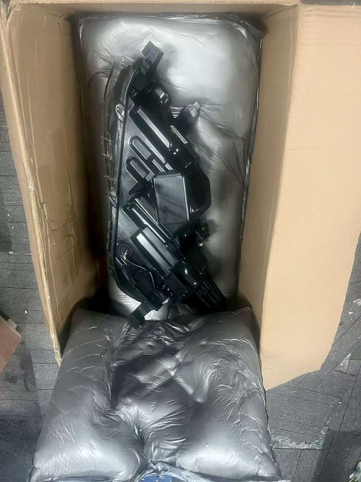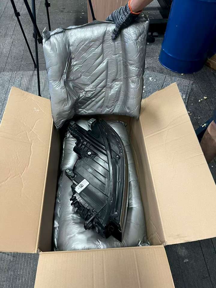 首先在箱子内部铺上耐高温的塑料薄膜,把胶打入塑料薄膜内,让其发泡,然后折叠好塑料薄膜,在发泡的时候,把汽车车灯放在塑料薄膜上按压塑形,然后再把塑料薄膜铺在车灯上面,继续打胶,形成360度无死角的保护层。