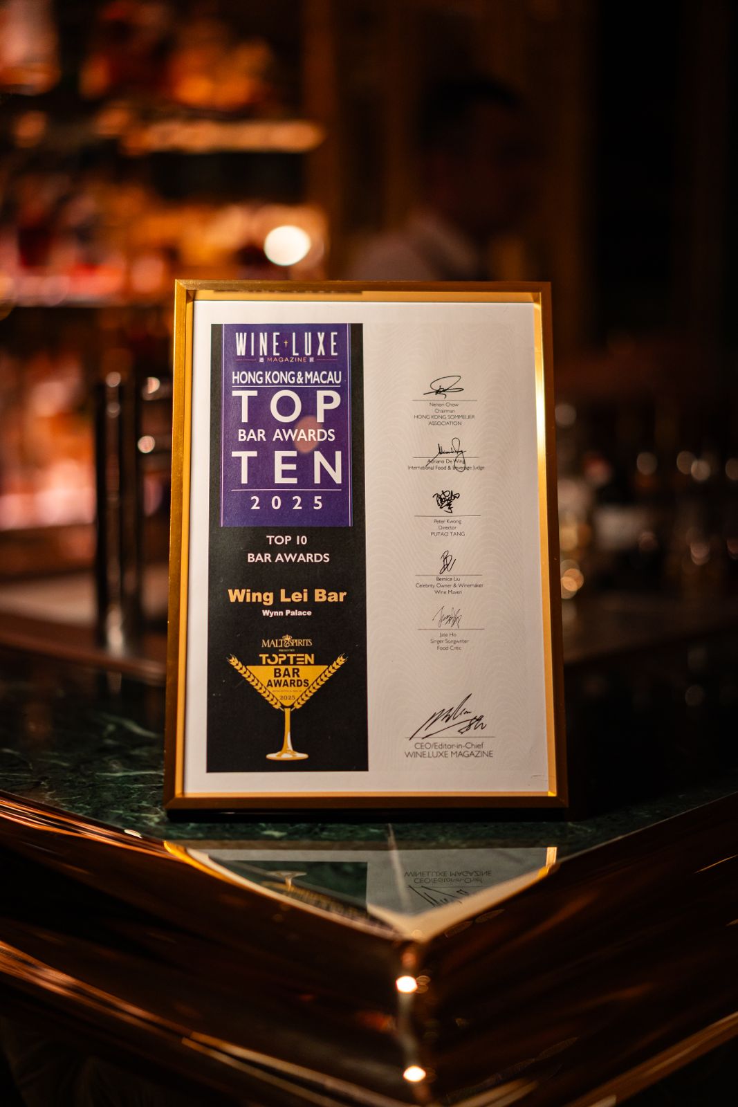 永利吧再度获得肯定,脱颖而出获《Wine Luxe》杂志评选为港澳十大酒吧之一。奖项的评选聚焦五大维度:鸡尾酒创意与质量、酒吧氛围与设计美感、社交媒体吸引力、调酒师技艺与待客之道,以及可持续经营实践。此奖项是对永利吧在创新、匠人精神与卓越服务等多方面表现的高度肯定,确立其作为探索非凡酒饮体验的品味人士首选。