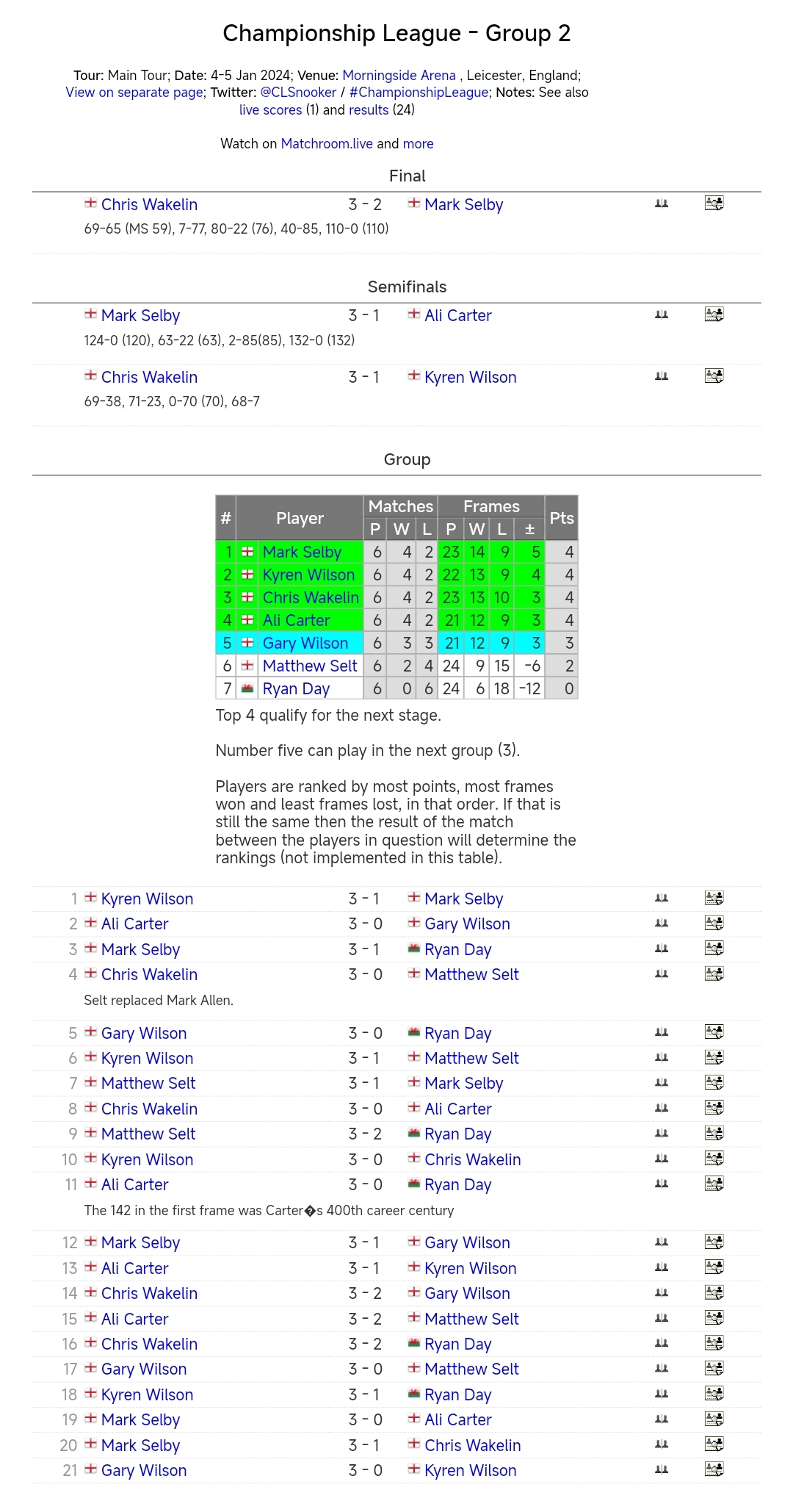 在小组循环赛阶段,有四名选手都取得4胜2负的战绩,最终依据胜负情况及单杆分数,塞尔比排名小组第一,凯伦·威尔逊、韦克林和阿里·卡特位列第2-4位,四人进入小组淘汰赛(5局3胜)。加里·威尔逊3胜3负,小组第5,保留下一组的参赛资格。赛尔特2胜4负排第6位,瑞恩戴未尝一胜小组垫底,二人出局结束比赛。