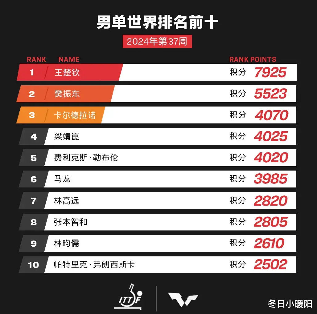 梁靖崑的世界排名是第4,他与第3的卡尔德拉诺实际上也只差45分而已,梁靖崑如果在本次WTT澳门冠军赛夺冠那么他会升至世界第三。