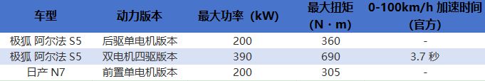 日产 N7 搭载的是前置单电机,最大功率为 200kW,最大扭矩为 305N・m。从数据上与极狐 阿尔法 S5 的单电机版本相比,功率相同,但扭矩稍低。实际驾驶中,日产 N7 的动力输出比较线性,在城市通勤场景下,能给人带来平稳舒适的驾驶感受,不过在爆发力和高速超车的瞬间加速能力上,相比极狐 阿尔法 S5 要稍逊一筹。如果你追求更强的动力性能和驾驶激情,极狐 阿尔法 S5 显然更适合你;而如果你更注重日常驾驶的平稳性,日产 N7 也能很好地满足需求。