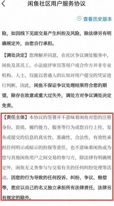 对此,闲鱼在《社区用户服务协议》中,和大部分平台的做法如出一辙,通过格式条款将自己的责任剥离殆尽。