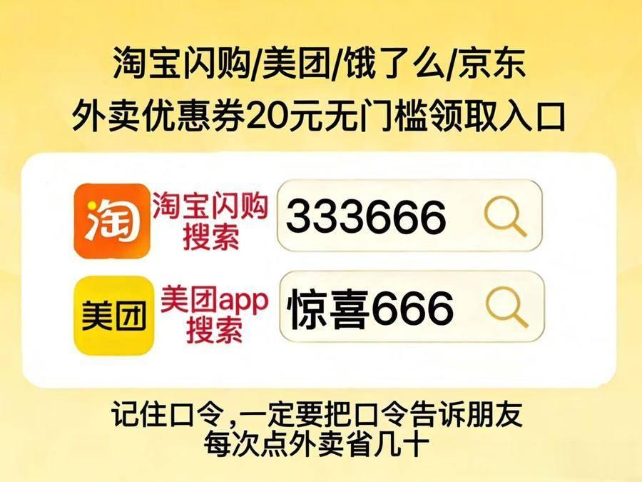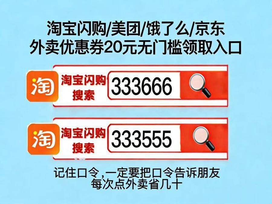 淘宝闪购搜【333666】【333555】【333777】,新老用户每日均可领取,多张大额无门槛外卖券随心领,日常点单天天都能省。