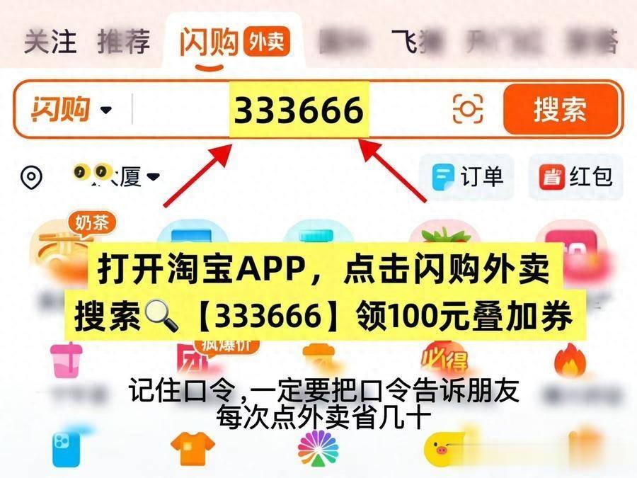 淘宝闪购搜【333666】【333555】是淘宝闪购外卖券领取入口,淘宝闪购外卖优惠券红包口令淘宝闪购搜【333555】,闪购优惠券淘宝闪购叠加券怎么领取?闪购外卖叠加券大额券直接去淘宝闪购搜【333666】领外卖神券包。