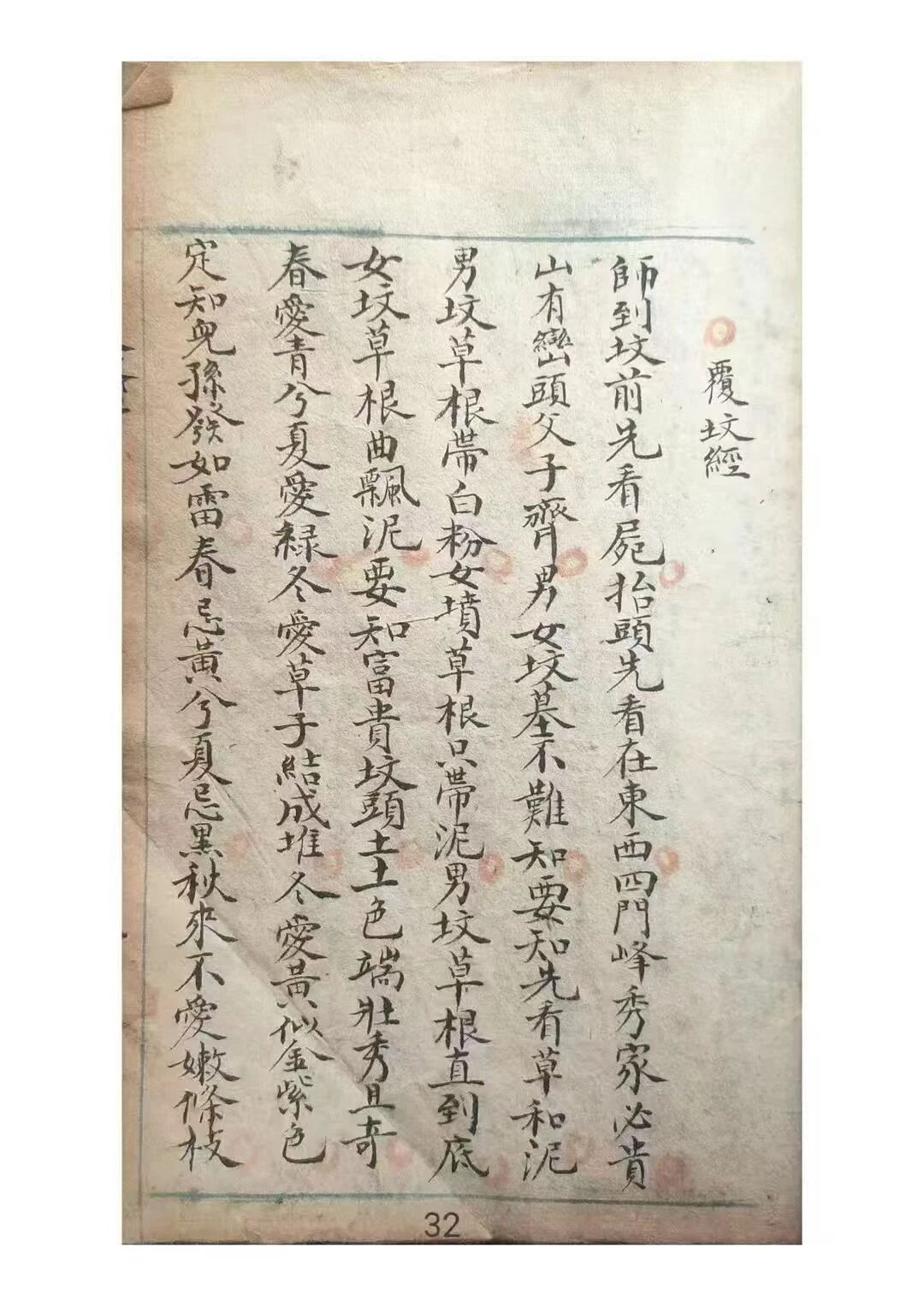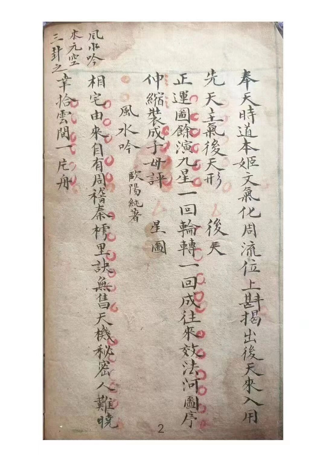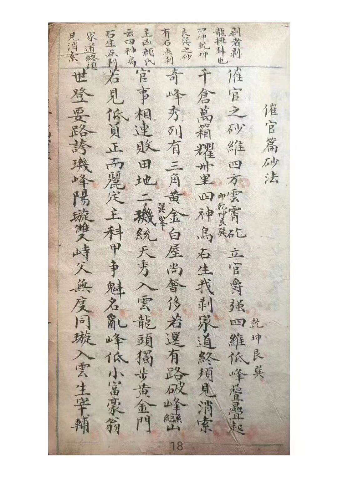 典籍最鲜明的价值,在于 “手抄传世” 的文物特质与 “聚焦核心” 的知识架构。全书以 “形理合一” 为原则,开篇 “题无极子图” 与欧阳纯《风水吟》以图文结合奠定根基,“龙真穴的藏生气,砂抱水环聚福缘” 的诗句,精准概括 “观形察气” 的核心逻辑。作为清代手抄本,其字迹工整,“九星吉凶歌”“催官篇砂法” 等内容的朱笔圈注犹存,为解读技法提供关键线索。69 页篇幅剔除冗余,浓缩 “龙穴判断、砂水格局” 等议题,既延续《葬书》“气乘风则散,界水则止” 的正统脉络,又融入民间经验,纠正 “堪舆偏科” 的认知误区。