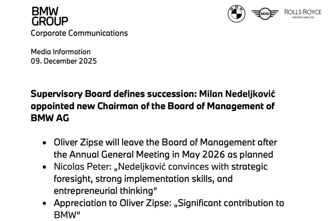 该举措已获得监事会批准,内德尔科维奇将在宝马年度股东大会后立即接任,该股东大会计划于2026年5月14日举行。宝马历史上的CEO基本都从内部选择,并且在工作资历上都要求在生产制造研发端等领域有相应的工作经验。内德尔科维奇于1993年加入宝马公司 ,在2019年加入管理委员会之前,曾在该公司的牛津、莱比锡、慕尼黑和企业质量部门担任管理职务。