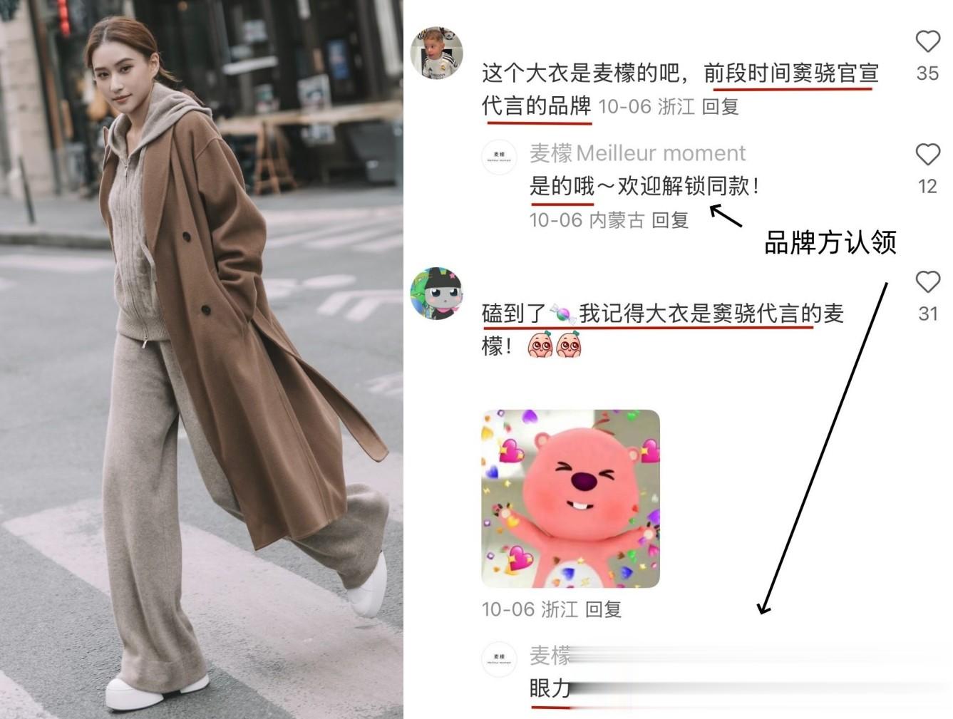 有网友认出何超莲穿的大衣是窦骁代言的,在评论区表示“嗑到了”,品牌方火速跳出来认证,“是的哦”、“眼力一百分”,生怕大家没发现。