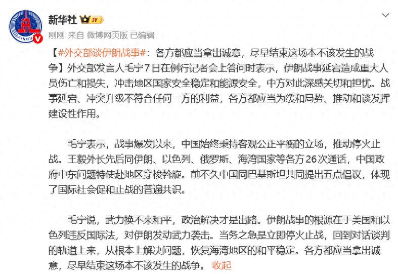4月7日停火达成前夜,中方在最后时刻介入,敦促伊朗保持克制、展现灵活性。