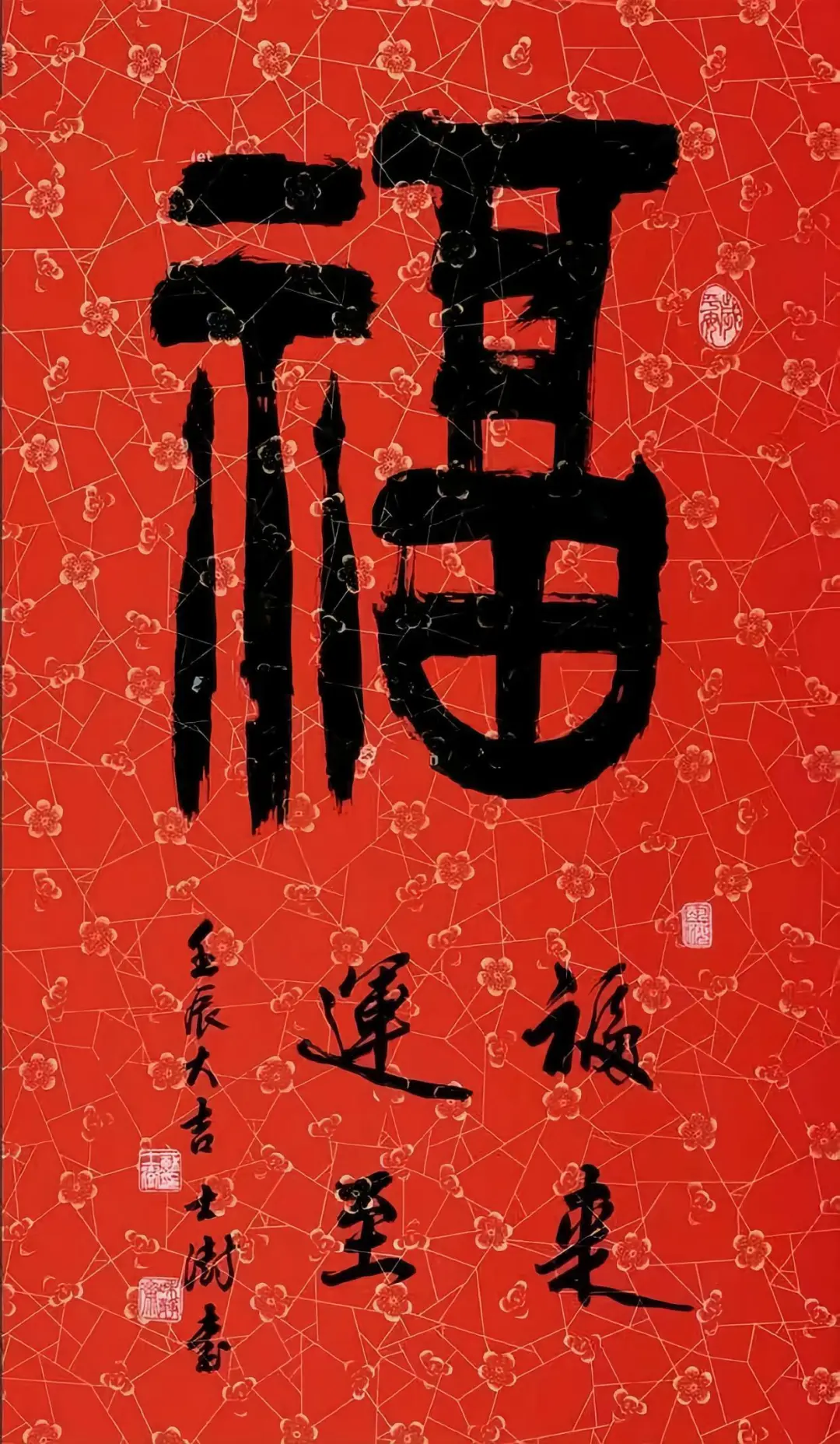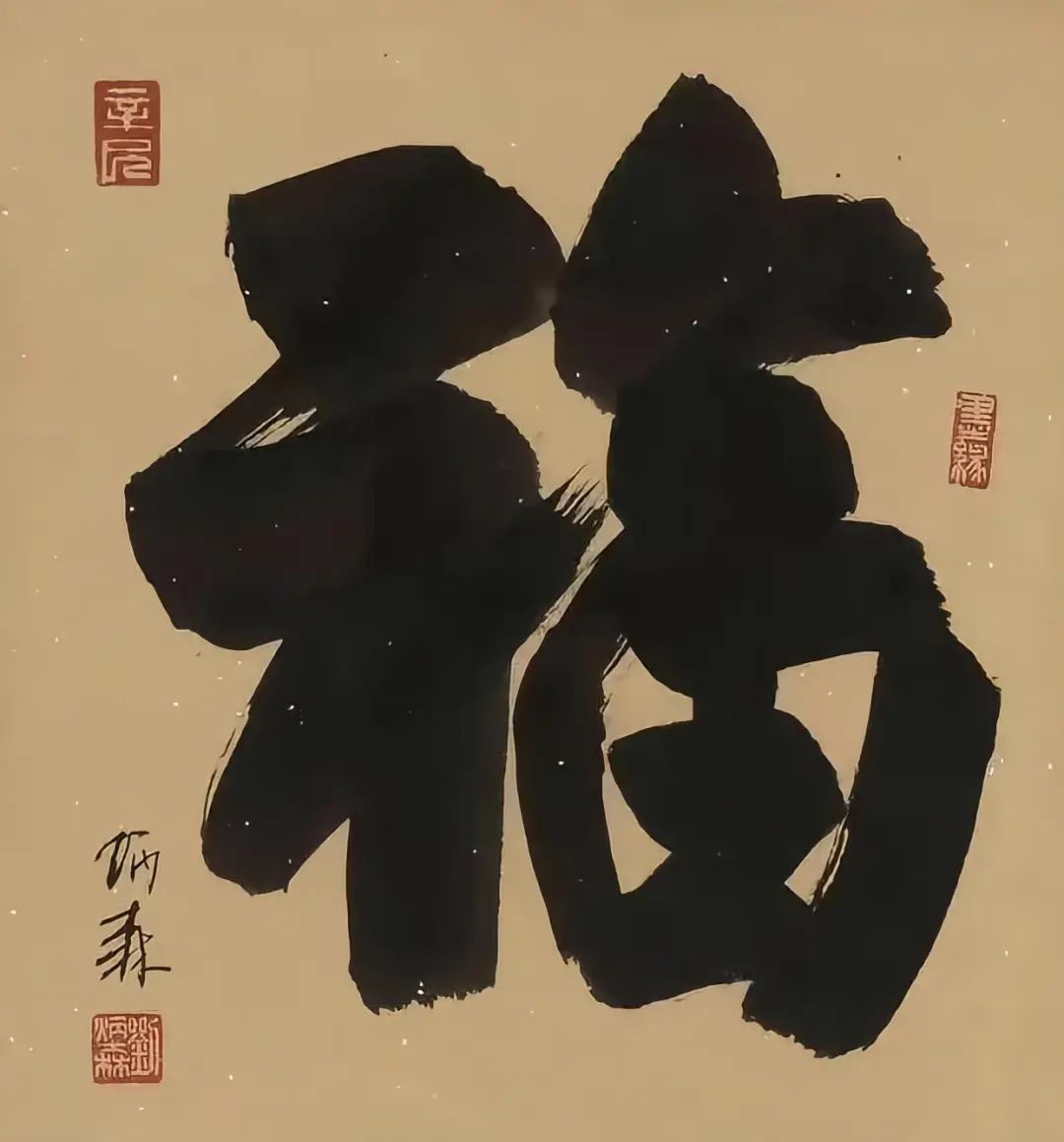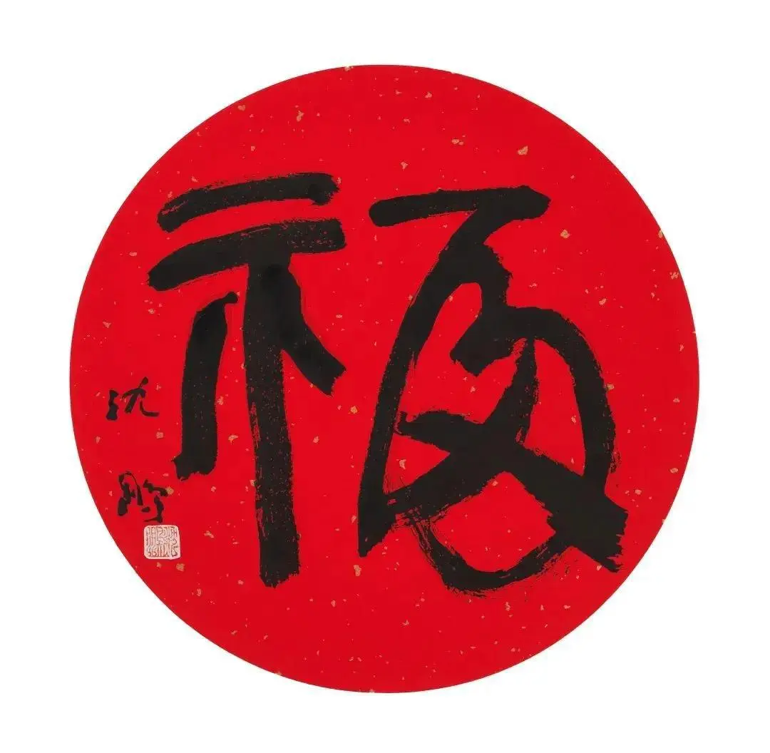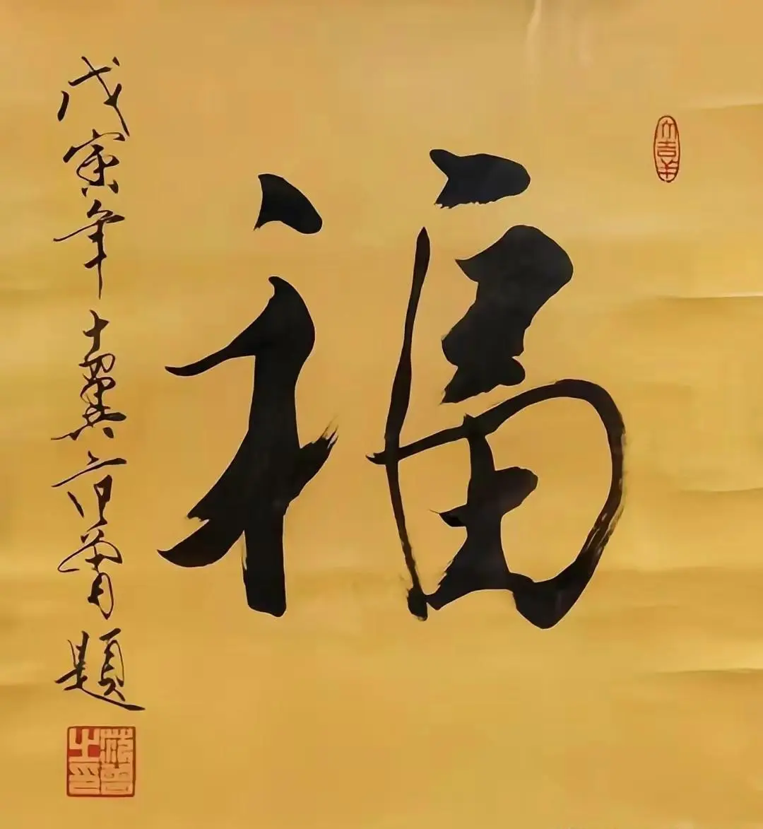 他的“福”字,很有特点,左窄右宽,左高右低,看似向右下倾斜,但是落款恰到好处,起到了平衡的作用,整体看来,还是很和谐的。