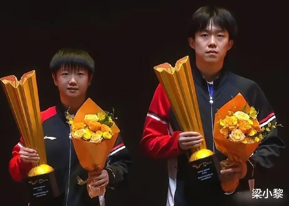 北京大满贯混双决赛,孙颖莎与王楚钦以比分3-0完胜队友黄友政/陈熠,夺得混双冠军。