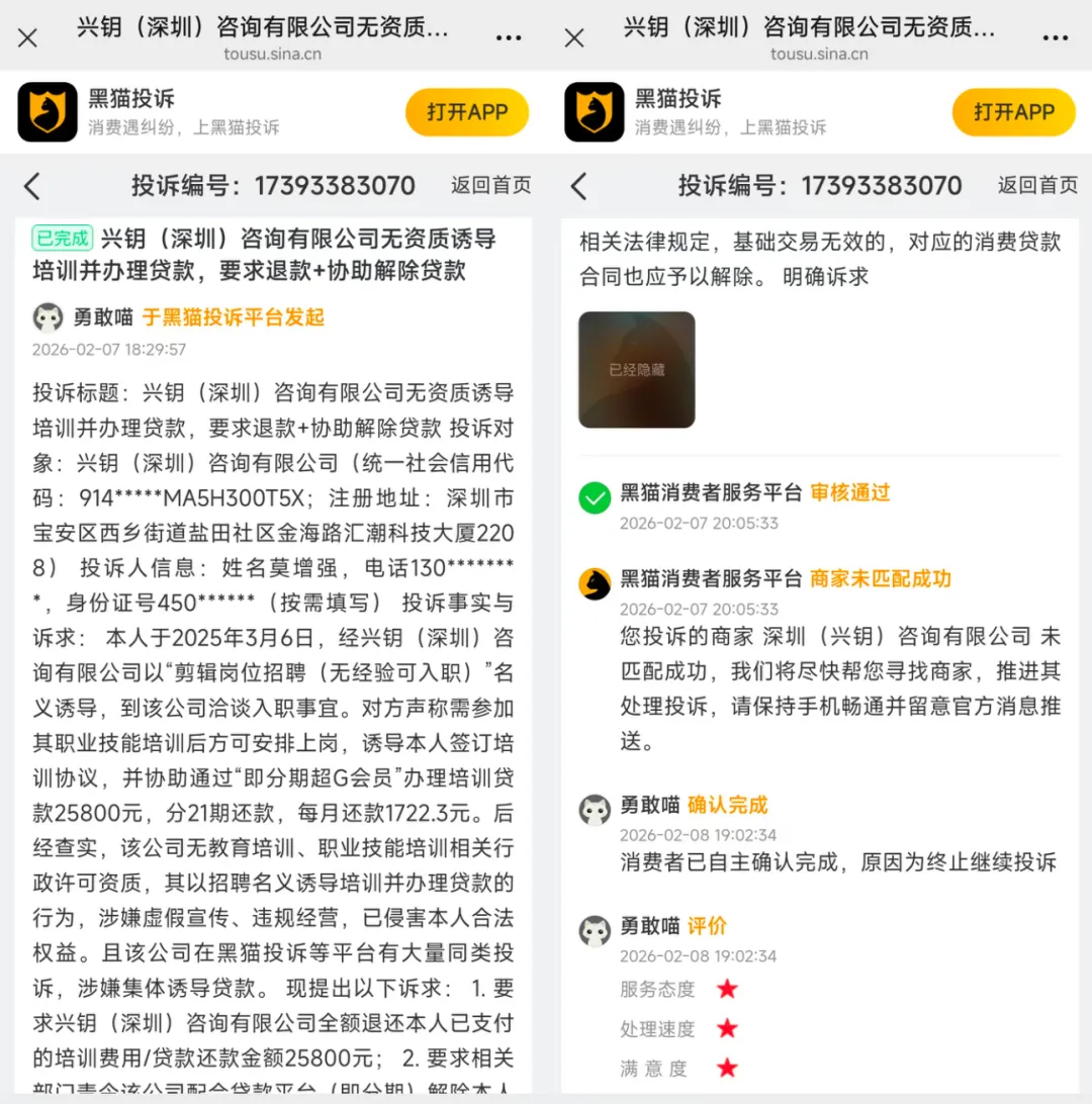 2月7日,有网友实名在黑猫投诉,其于2025年3月6日,被兴钥(深圳)咨询有限公司以“剪辑岗位招聘(无经验可入职)”名义诱导,在该公司参与职业技能培训并办理了培训贷款,贷款金额为25800元,分21期还款,每月需还款1722.3元,贷款机构为“即分期超G会员”。