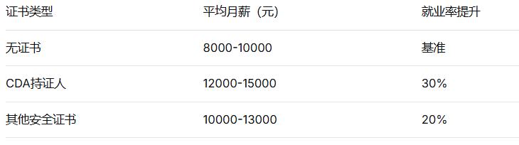 与其他证书相比,CDA更注重大数据和AI应用,持证人平均薪资高出25%以上,如下表所示: