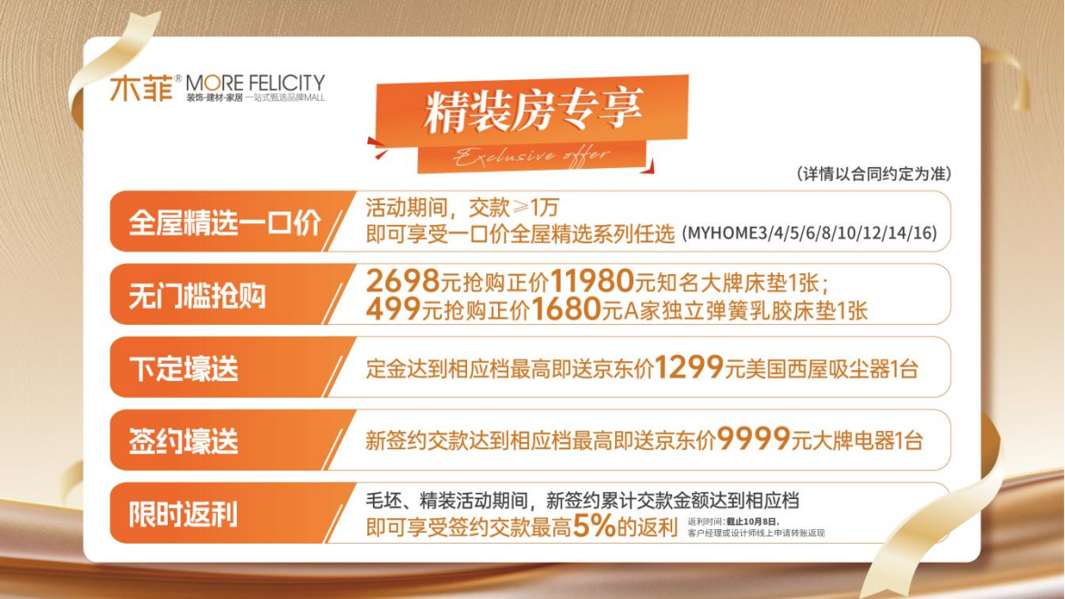 木菲特意准备了开业专属福利(即日起至 2025 年11月30日)到店预约您的专属客户经理即可免费领取 AI 全套设计方案,设计师免费上门量房,免费出专属效果图以及精准报价,生成专属方案;以及参与木菲“十月金秋家装节”的优惠活动:2698元无门槛抢购正价11980元大牌床垫;签约壕送万元大牌电器;集团柜类、软装补贴,全单返利最高5%等超多优惠活动!