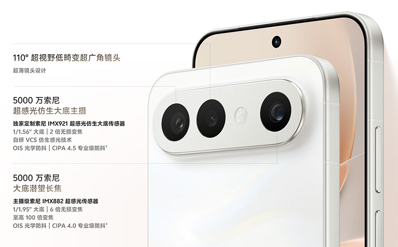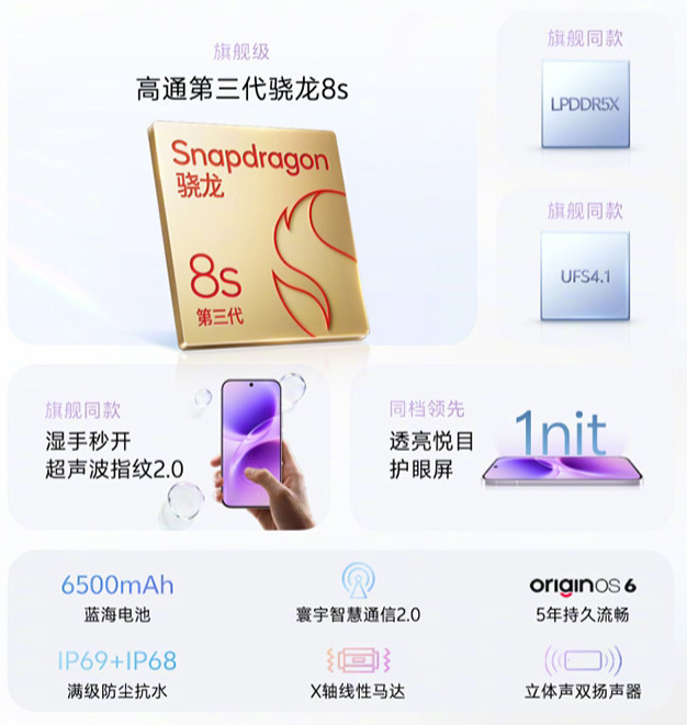 核心配置上,vivo S50搭载了6.59英寸屏幕和高通第三代骁龙8s处理器,前置5000万像素摄像头,后置5000万主摄、5000万潜望长焦以及800万超广角镜头,电池容量为6500mAh,支持90W闪充。