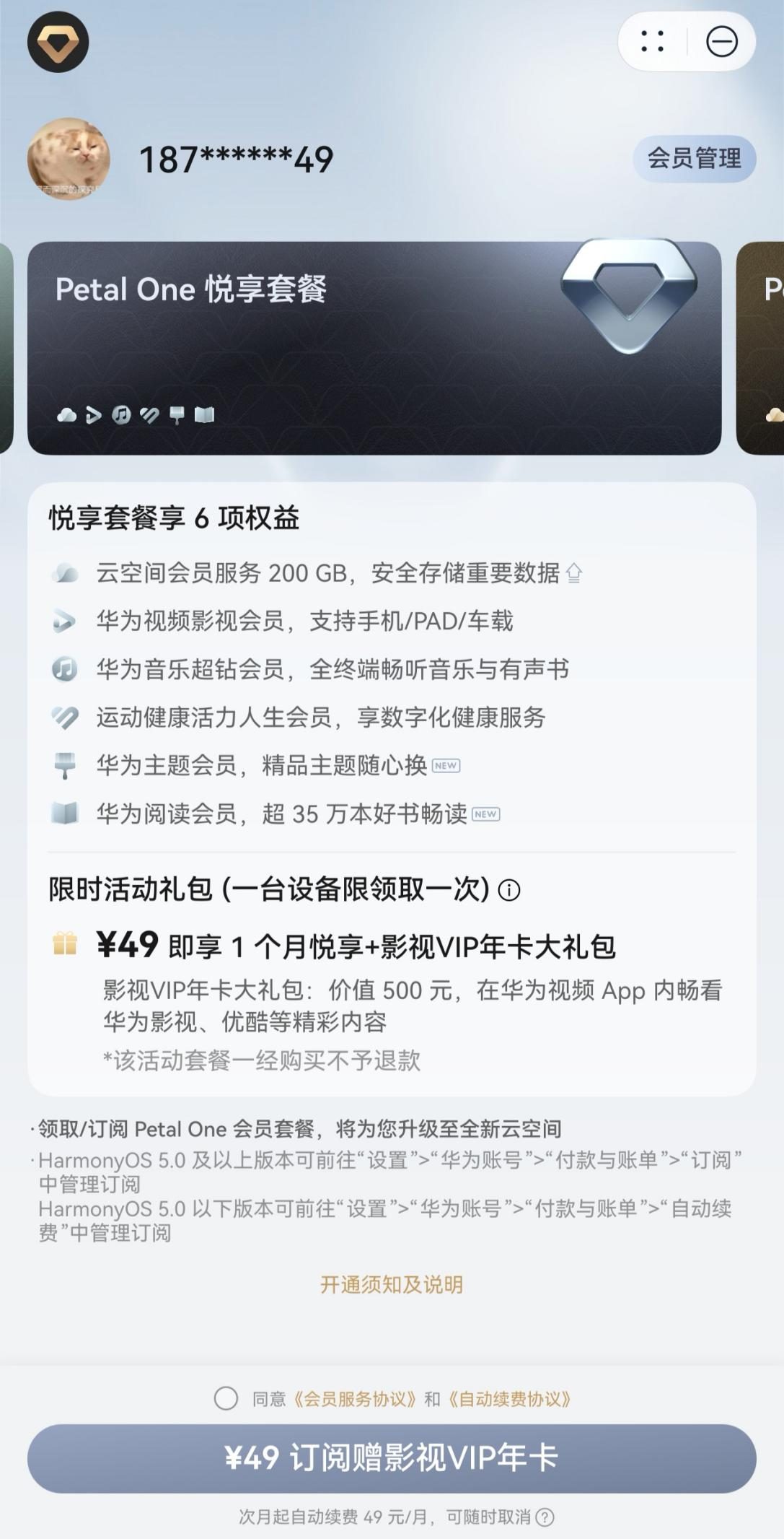 Petal One会员不是某个单一App的会员,而是 “华为会员全家桶” ,一次性打包了云空间、视频、音乐、阅读、主题和运动健康六大会员权益。它还准备了畅享、悦享和尊享三种套餐可选,连续包月价格分别为29元、49元和159元。算一笔账就明白,这比单独开通各项会员要划算太多。现在新用户订阅悦享/尊享会员,除了本身一个月会员权益外,还赠送影视VIP年卡大礼包,就可以在华为视频畅看芒果优酷的内容,还是一整年!
