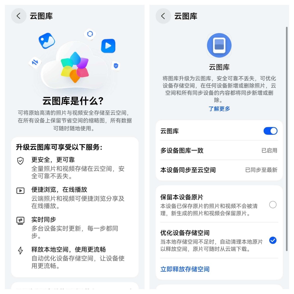全新升级的华为云空间支持自动释放本地存储空间,只需要在华为云空间里打开“云图库”并选择“优化设备存储空间”,然后系统就自动把设备上所有的照片视频都安全同步到了云端 。更聪明的是,它还会基于我手机的存储情况,自动把不常用的照片、视频替换为用于预览的较小版本,高清原片随时可以从云端下载,瞬间我的手机本地空间就被释放了。