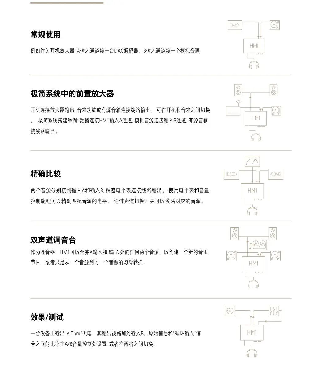 另一方面,配合HM1可以任意切换或同时出声的,两通道输入,她也非常适合发烧友对比各种器材,折腾声音的各种玩法。类似对比数播和黑胶、不同解码器、放大器,甚至接个模拟调音台,给耳机、音响、房间校声啥的,HM1本身就是个非常高效的,参考级的,进行音质对比用的核心器材。
