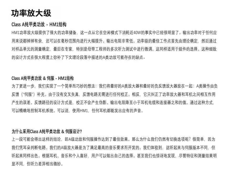 他这个负反馈,和常规的负反馈也不太一样,我浅薄的认知里,常规可能是针对机内信号失真给的负反馈;而HM1的意思,是自己的纯甲类本身没有失真重影,这个负反馈设计,是针对不同耳机+接口部分的阻抗,HM1主动识别耳机特性,然后负反馈消除其中可能产生的所有失真。