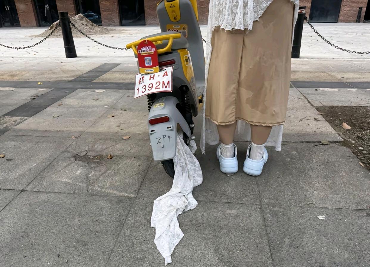 由于女生当时穿的长裙,刚上车就发现裙摆卡进了后轮毂了,女生差点直接倒地,但她还是拼尽全力控制住了姿态,女生站起来后,后轮都悬空了,可见裙摆已经卡了一大截进去。