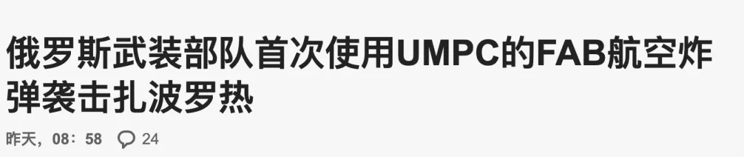 当日,俄罗斯武装部队首次使用UMPC的FAB航空炸弹袭击扎波罗热,目前俄罗斯专家正在设法扩大FAB航空炸弹的使用范围,并希望未来能够更广泛使用于扎波罗热地区。