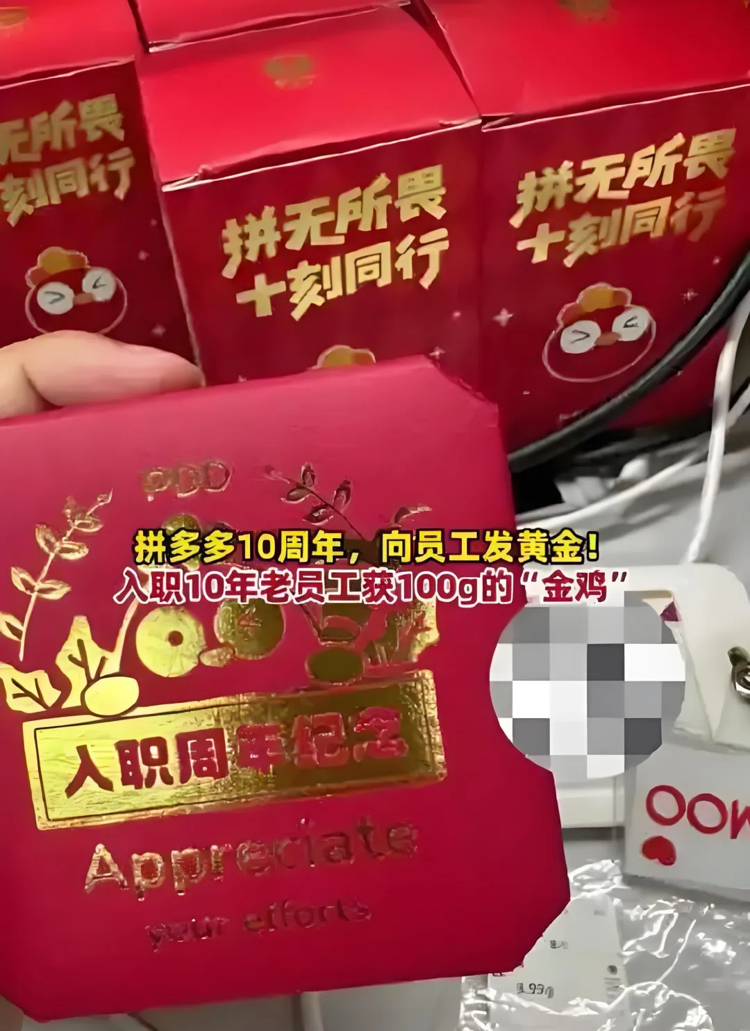 同一天,拼多多也因“撒金”刷屏——入职满10年的员工领到100克金砖(价值约9.4万元),5年员工拿11克金戒指,3年员工刻名戒指。这是拼多多十周年的“黄金礼”,比去年金砖重量提升40克。网友调侃:“拼多多这班没白上,黄金比年终奖实在!”