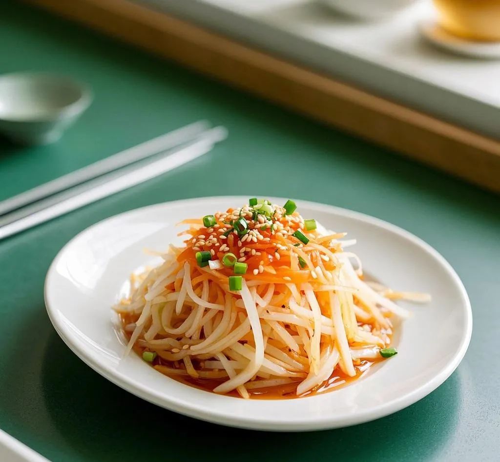 所需材料:萝卜1个(中等大小),去皮切丝、米醋、生抽各适量、白糖少许、蒜末、辣椒末适量(可选)、香油几滴