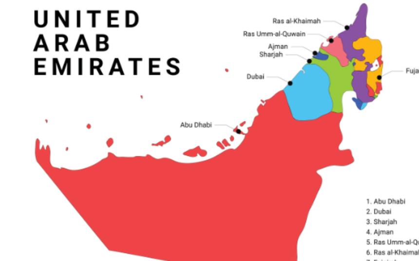 阿联酋,是由7个酋长国组成的联邦君主国,按照面积大小排列为:1.阿布扎比(Abu Dhabi)、2.迪拜(Dubai)、3.沙迦(Sharjah)、4.哈伊马角(Ras Al Khaimah)、5.富查伊拉(Fujairah)、6.乌姆盖万(Umm Al Quwain)、以及7.阿治曼(Ajman)。