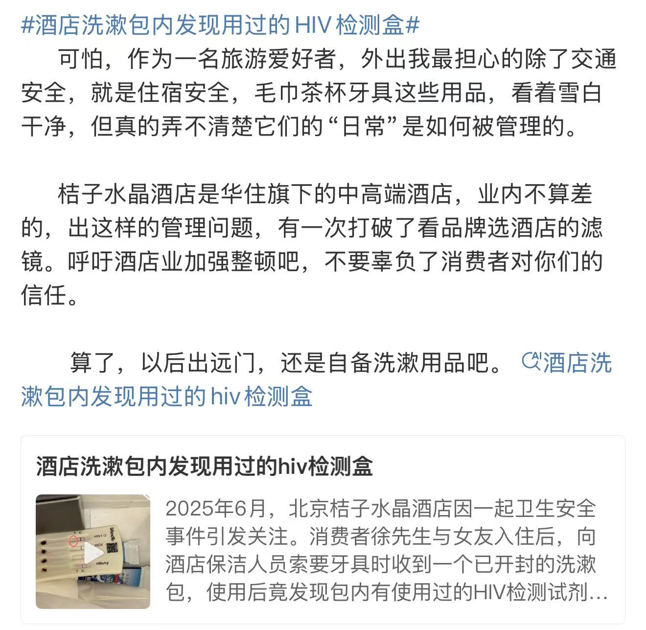 6月17日,北京东城区桔子水晶酒店崇文门店发生一起引发公众高度关注的事件:顾客徐先生及其女友在酒店提供的洗漱包中发现一支疑似HIV阳性检测盒,且盒上残留血迹。事件曝光后,酒店所属的华住集团迅速回应,称已对涉事员工严肃处理,并承诺承担后续可能出现的感染风险责任。目前,警方及卫生部门已介入调查试剂盒来源。