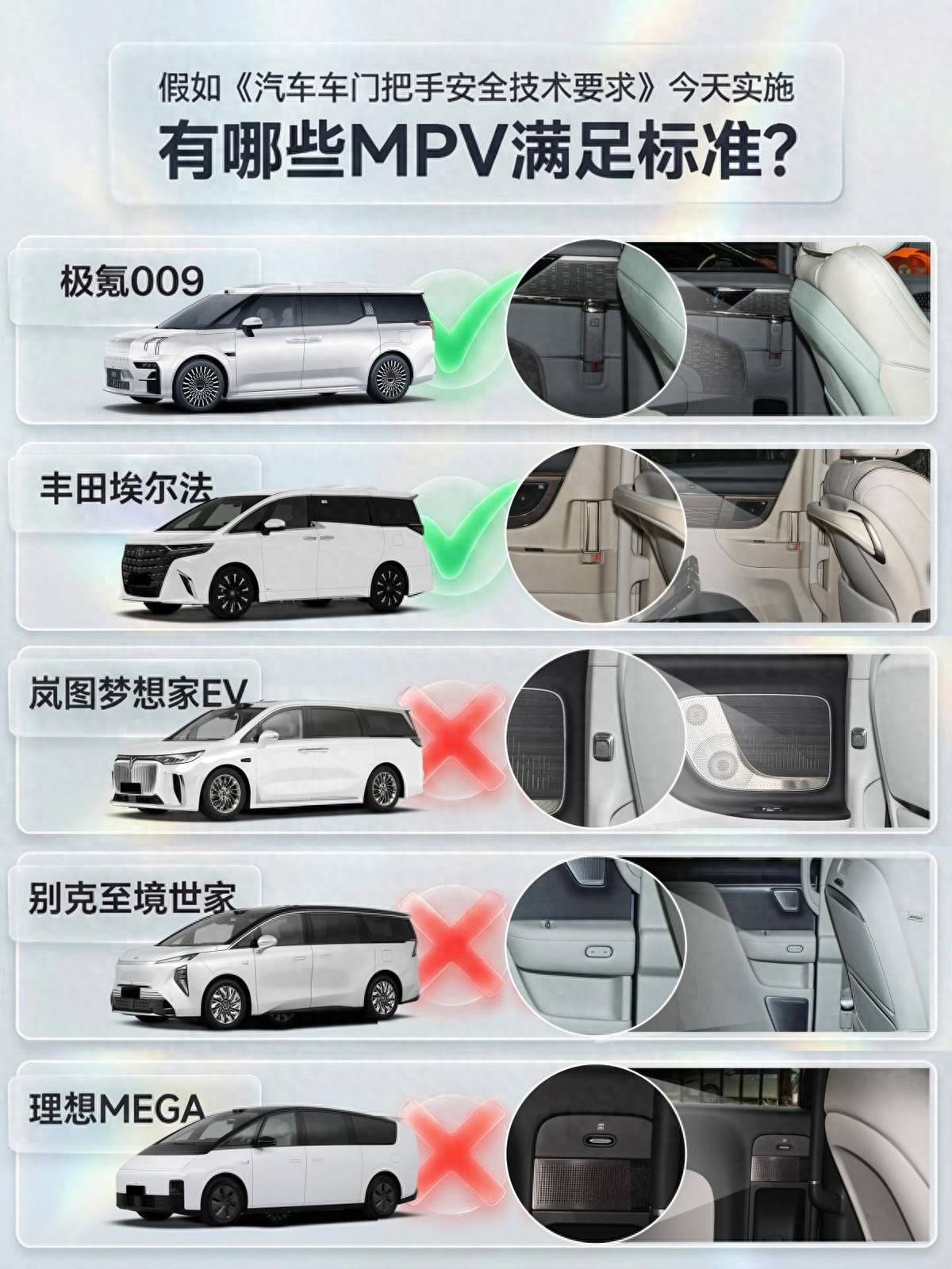 对比目前市面上热门的几款MPV,极氪009和丰田埃尔法这两个头部玩家是满足标准的,而我是没想到刚上市的至境世家居然都不符合标准,所以X9和MEGA不符合也就显得情理之中了……