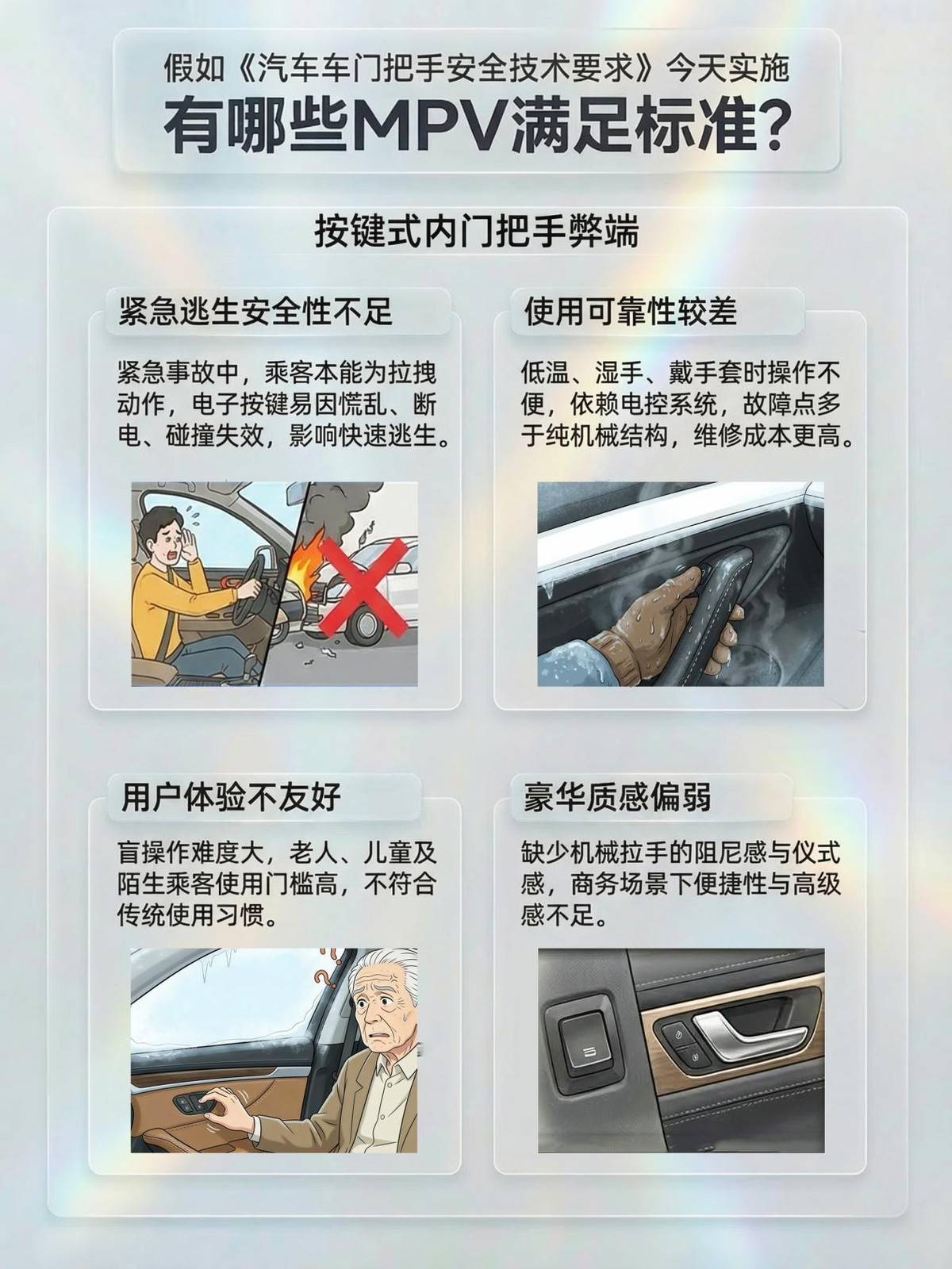 2027年1月1日即将实行的车门把手新标准,车门内把手安全要求:每个车门(不包括背门)应配备至少一个机械车门内把手,且独立操作任一车门内把手应能够开启对应车门。