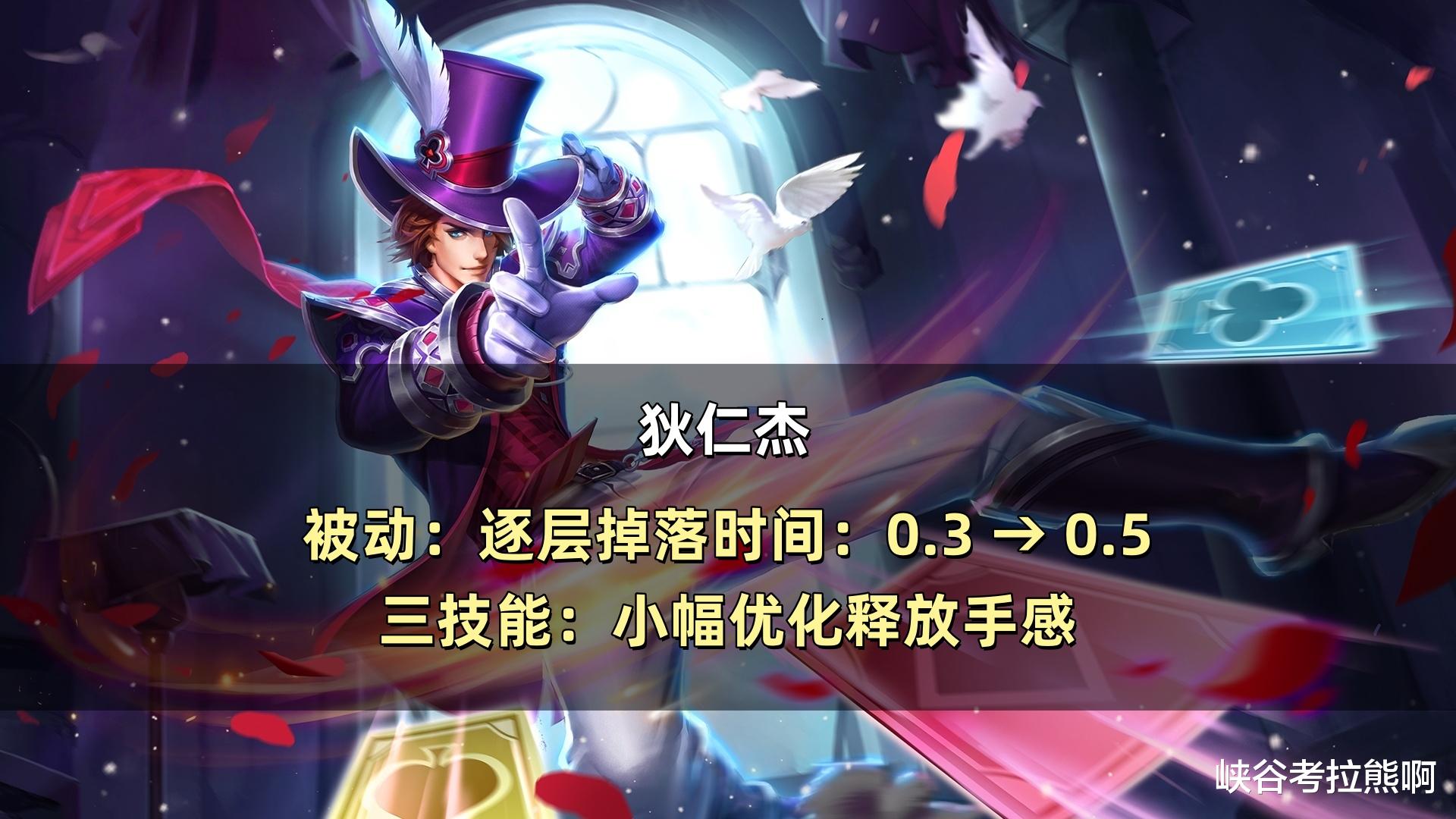 本次官方将狄仁杰被动逐层掉落的时间从0.3秒提高到了0.5秒,顺便优化了大招的释放手感。