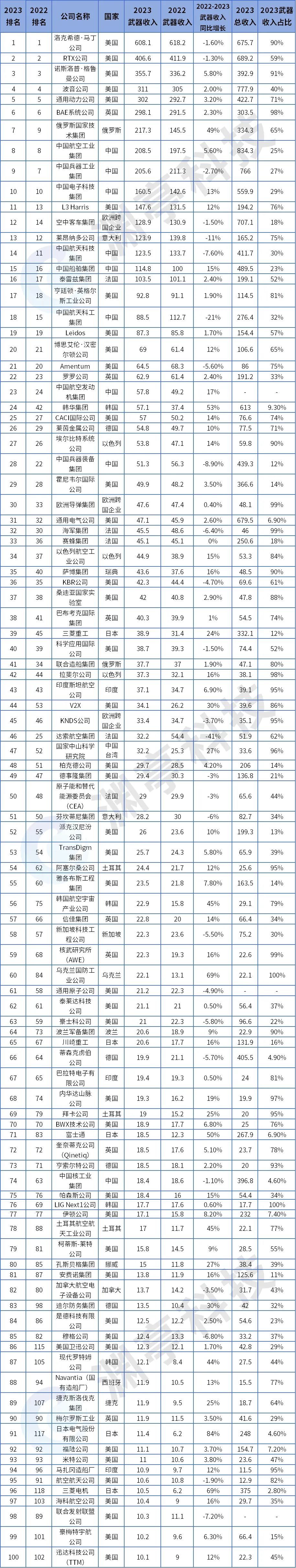 SIPRI最新全球百强军工企业名单(收入单位:亿美元)