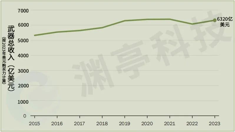 根据斯德哥尔摩国际和平研究所(下文简称SIPRI)公布的最新全球百强军工企业名单,世界百强武器生产和军事服务公司的武器收入总和在2023年同比增长4.2%,达到6320亿美元。自2015年至2023年,全球百强军工企业的武器总收入增长了19%(见图1)。