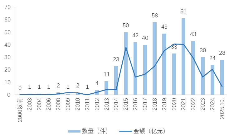 结合2000年至2025年10月的投融资数据来看,宠物经济行业自2015年起进入高速增长通道,当年融资金额达37.77亿元、事件数达50件;这一热度在2018至2021年间达到顶峰,其中2021年以61起事件成为投资最活跃的一年,而2020年则以40.5亿元创下金额峰值。行业在2022年后进入调整期,融资金额与事件数量均呈现回落趋势。2024年金额出现小幅反弹至20.59亿元,2025年有回暖趋势,截至2025年10月,投融资事件28起已超过2024年数据。