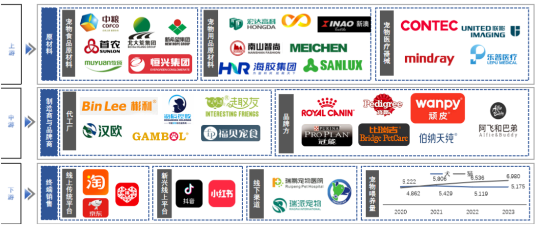 下游为宠物相关产品服务终端市场,主要分为线上、线下两大销售渠道。线上渠道又包括线上传统平台、新兴线上平台,线下渠道包括宠物店、宠物诊疗机构等。