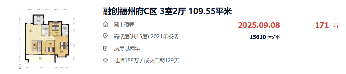 融创福州府C区,最近成交109平高层精装1.56W,当初2.7W,跌43%