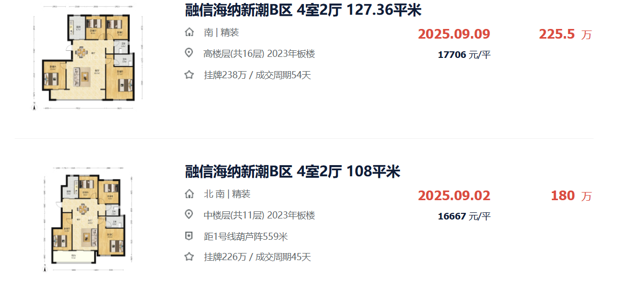 融信海纳新潮B区中高层精装成交1.7W左右,当初精装2.9W,跌42%