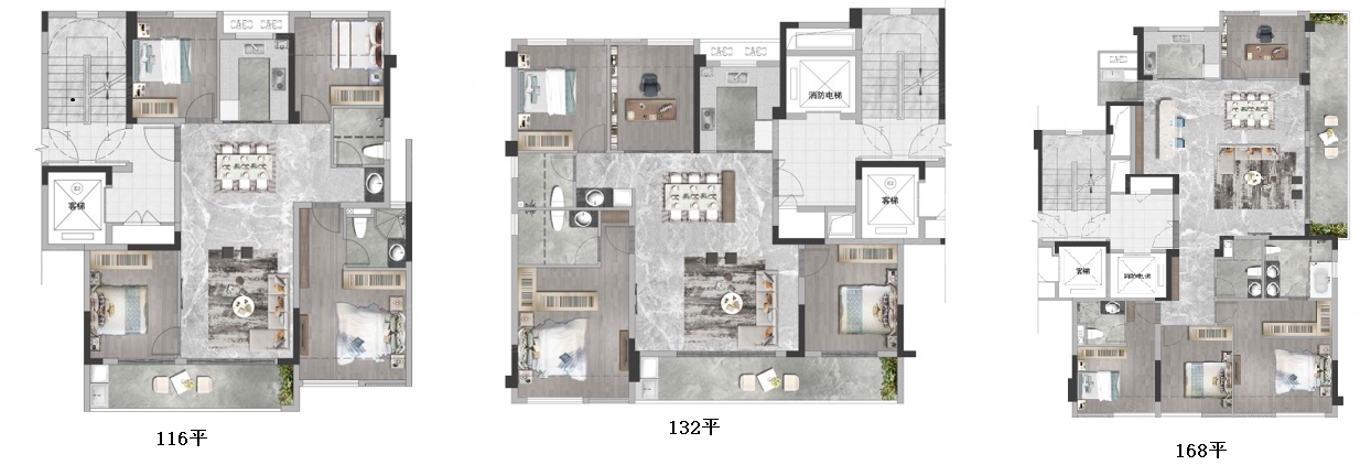 对于小高层项目,主推大平层:116平-168平,独梯产品。