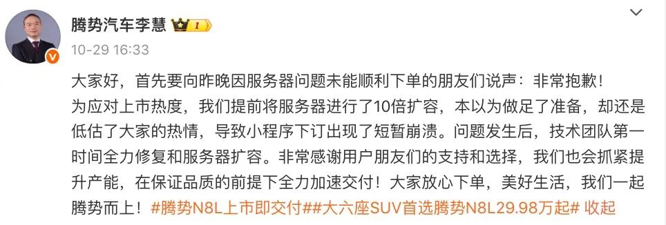 N8L 上市后,腾势总经理李慧在群访中表示,“预订量非常火爆,为了应对上市热度,我们提前将服务器进行了10 倍扩容,本以为做足了准备,但还是低估了大家的热情。”系统奔溃了十几分钟,火爆程度超出想象。