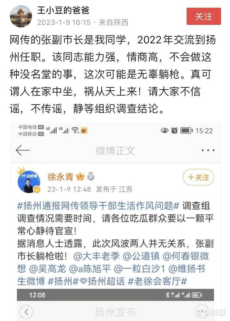 有一个来自陕西的网友发文称:网传的张副市长是我同学,2022年交流到扬州任职。该同志能力强,情商高,不会做这种没名堂的事,这次可能是无辜躺枪。真可谓人在家中坐,祸从天上来!请大家不信谣、不传谣,静等组织调查结论。