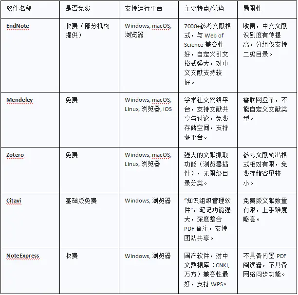 此表旨在对常用文献管理软件进行比较分析,帮助研究人员选择最适合其工作流程的工具。通过突出各软件的优缺点,该表使研究人员能够根据其主要文献语言、协作需求、偏好写作软件和特定功能(如笔记、PDF管理)做出明智的决策。这一明智的决策有助于提高整个写作过程的效率和引文准确性,从而提升综述文章的整体学术严谨性。