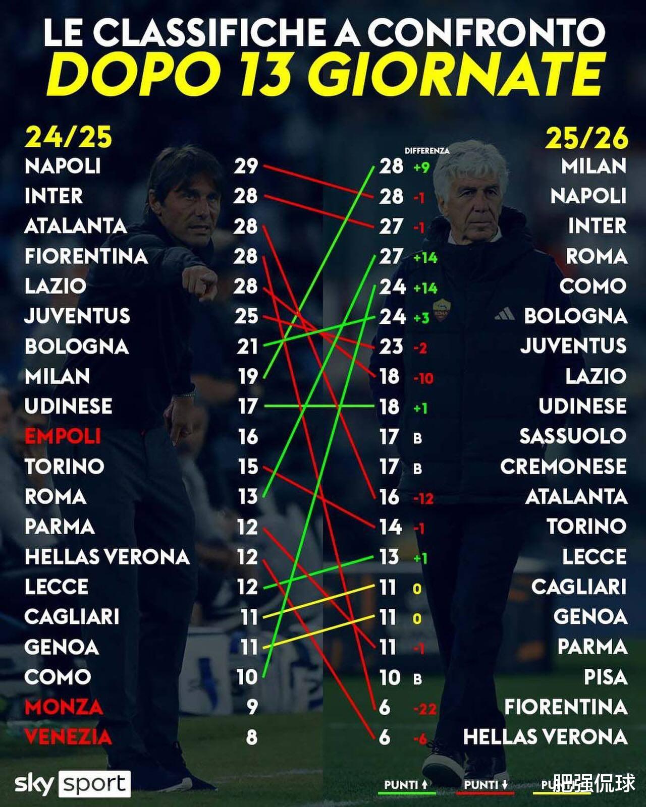 不过,在联赛赛程已过1/3的情况下,国米只比上赛季少了1分而已,排名虽然下滑了1位,但与榜首球队依然只有1分之差,球队的表现并没有出现太大起伏波动。顺便看一下其他球队,罗马和科莫是进步最大的两支球队,加斯佩里尼到来后助力罗马起飞,而科莫则是大举投入引援带来了实力上的跃升,单线作战的米兰则是多拿了9分领跑积分榜,是本赛季意甲重要的争冠力量!相比而言,佛罗伦萨和亚特兰大则都因为换帅原因导致本赛季成绩出现大幅滑落,特别是紫百合甚至需要为保级而战了。