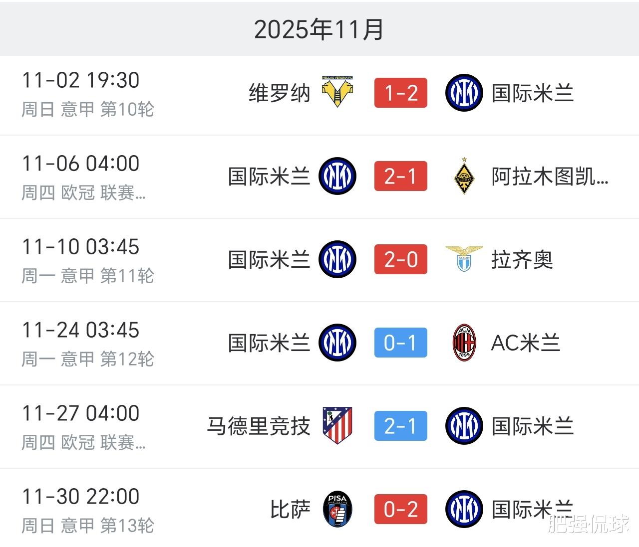 在上一轮客场2:0击败比萨后,国米也以一场胜利结束了11月的赛程。回顾整个11月,国米在6场比赛中取得了4胜2负的战绩,该赢下的比赛都赢了下来,整体还算是不错。不过在两场强强对话中,国米都是一球小负,而这两场比赛中国米在场面和机会上都稍占上风,但机会把握不住不说,面对AC米兰罚失点球,客战马竞在补时最后1分钟被绝杀,都错过了原本拿到1分的机会,也就是说国米距离单月不败其实很近了,只是可惜没能实现!