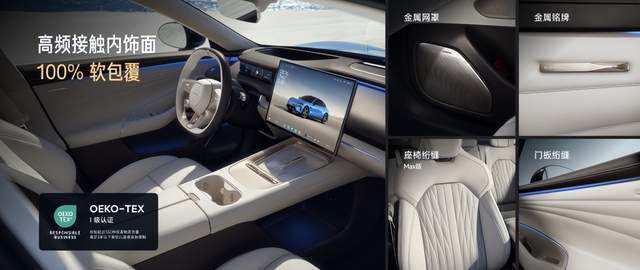 在内饰体验方面,新一代SU7的高频接触面接近100%软包,且通过了OEKO-TEX 100最高等级认证,满足3岁以下婴幼儿皮肤直接接触,孕妇、小朋友都可以放心乘坐。