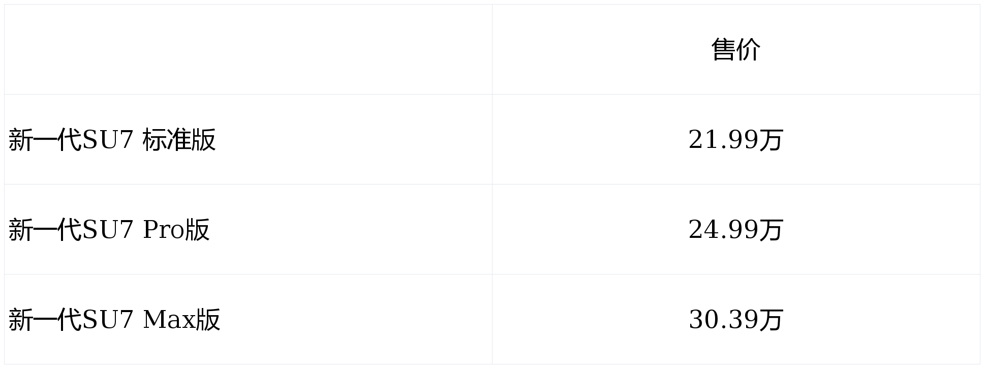新一代SU7发布标准版、Pro版、Max版三个配置,售价21.99万~30.39万