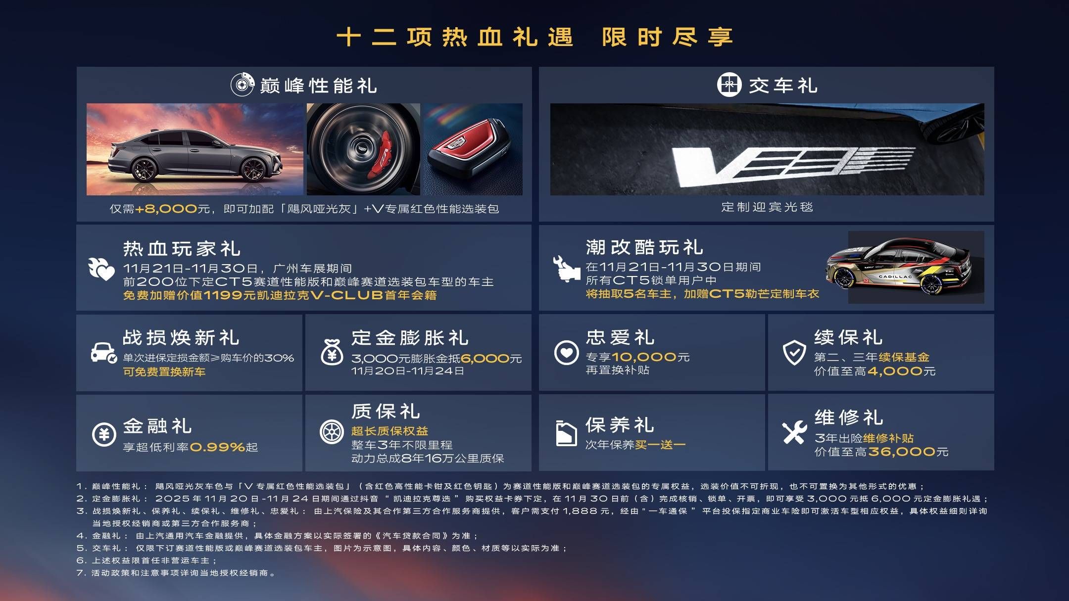 11月21日,2025广州车展凯迪拉克展台化身热血赛道派对,明星车型全新CT5以满改姿态热血登场,新车限时一口价20.69万元-26.59万元。