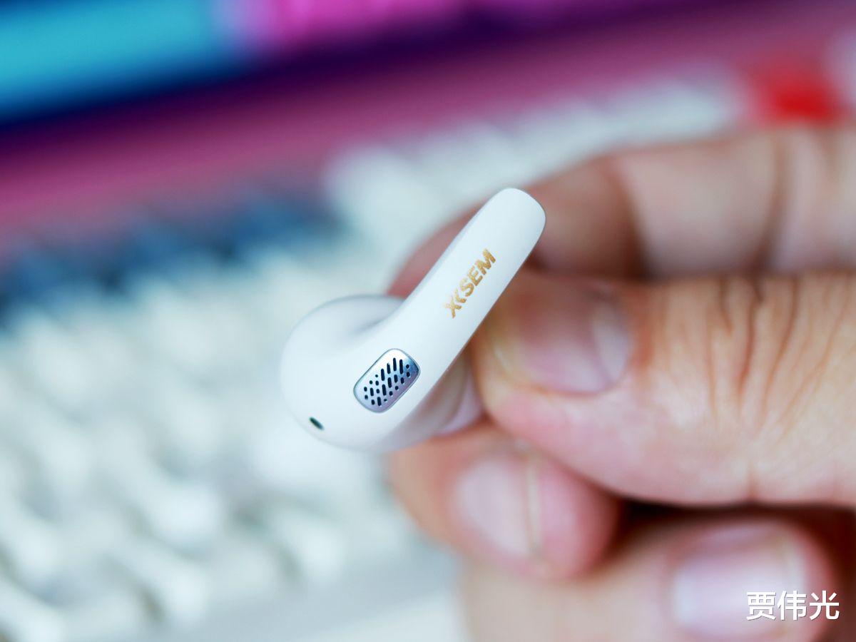 在它的外侧可以明显看到有个小小的金属网,这里既是触摸操作位置,也内置了状态指示灯,其实 不留意还真不知道状态指示灯藏在了这里,我也是佩戴好几天之后无意中发现的。在上方有一个麦克风小孔,外侧下方则是明显的“ XISEM”金色标志,辨识度很高。