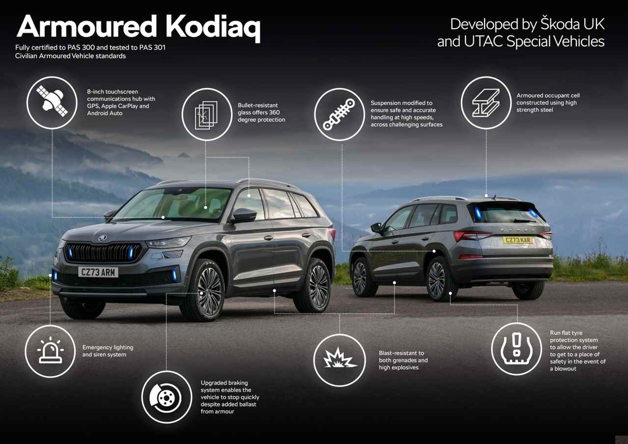 斯柯达推出了一款防弹版本的Kodiaq,由斯柯达英国分公司与安全专家UTAC Special Vehicles合作开发,